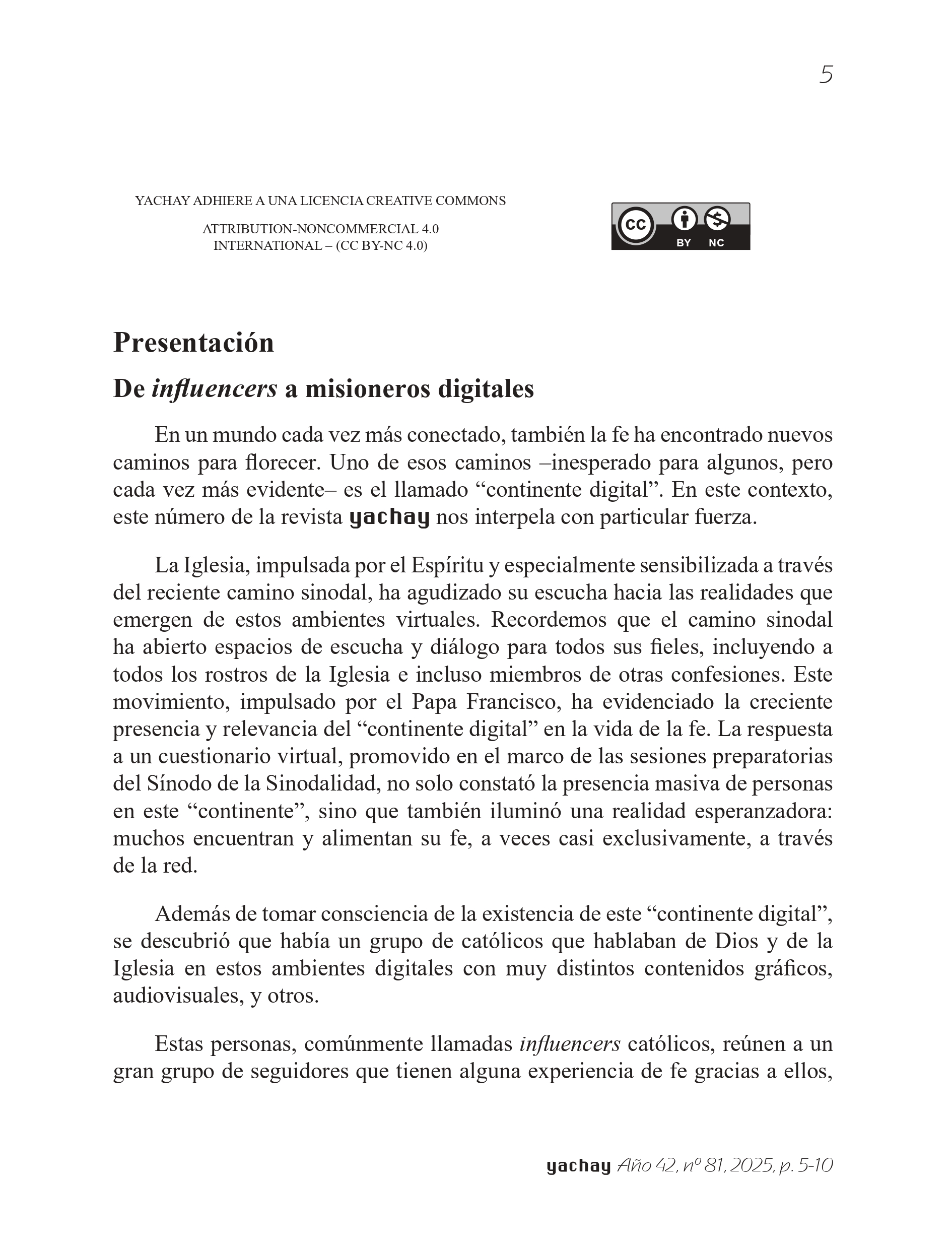 En un mundo cada vez más conectado, también la fe ha encontrado nuevos caminos para florecer. Uno de esos caminos –inesperado para algunos, pero cada vez más evidente– es el llamado “continente digital”. En este contexto, este nuevo número de la revista Yachay nos interpela con particular fuerza. Los artículos abordan experiencias pastorales innovadoras, como el Sínodo Digital, y proponen una inculturación del Evangelio en redes sociales, especialmente entre jóvenes alejados de estructuras eclesiales tradicionales. Se subraya la importancia de una pastoral digital respaldada canónicamente y con rostro samaritano. La sección miscelánea aporta reflexiones teológicas y bíblicas sobre la misión en redes, vistas como espacios de sed espiritual, encuentro y sinodalidad. El número concluye con una reseña del último libro de Gerhard Lohfink, ofreciendo claves hermenéuticas de los textos bíblicos fundamentales para la misión.