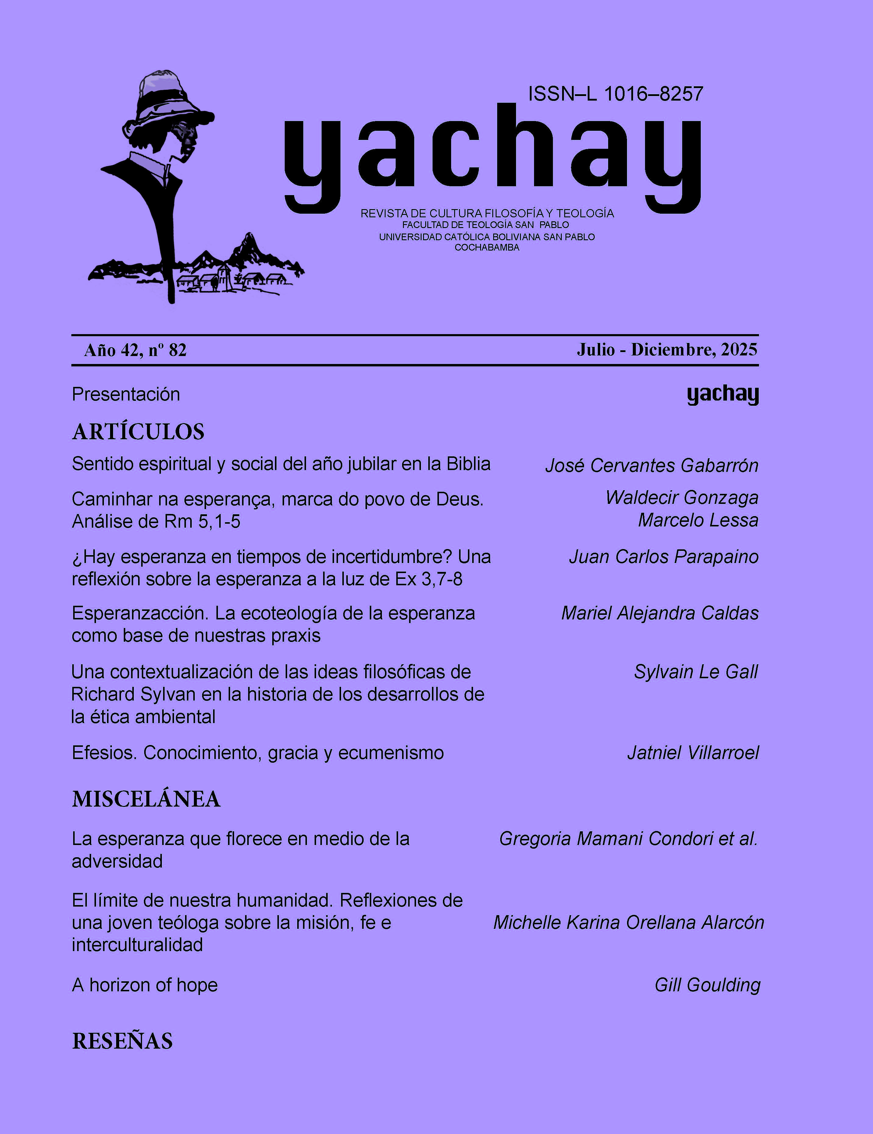 Vol. 42 Núm. 82 (2025)La Iglesia católica celebra en este 2025 un Año Jubilar, convocado por el Papa Francisco con la Bula Spes non confundit, traducida al castellano como “la esperanza no defrauda” (Rom 5,5). La temática de la esperanza se refleja de diversos modos en cuatro artículos y tres textos de miscelánea del presente número de Yachay, que además incluye un artículo sobre la ética ambiental y otro sobre la gracia en una carta deuteropaulina. Se presentan dos recensiones de libros: una sobre la cristología cósmica, y otra sobre la renovación eclesial. El conocimiento filosófico y teológico-espiritual es una categoría clave para generar innovaciones en nuestro modo de pensar y actuar. Los fundamentos bíblicos de la esperanza sustentan las variadas reflexiones teológicas que impulsan prácticas de transformación socio-ambiental.