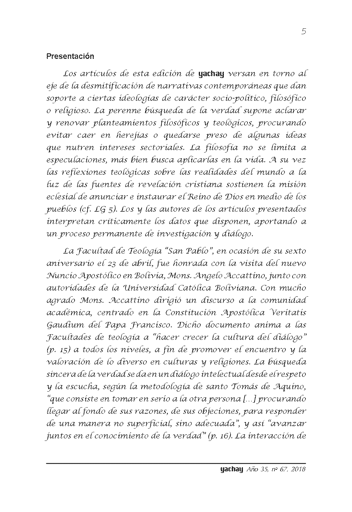 Los artículos de esta edición de Yachay versan en torno al eje de la desmitificación de narrativas contemporáneas que dan soporte a ciertas ideologías de carácter socio-político, filosófico o religioso. La perenne búsqueda de la verdad supone aclarar y renovar planteamientos filosóficos y teológicos, procurando evitar caer en herejías o quedarse preso de algunas ideas que nutren intereses sectoriales. La filosofía no se limita a especulaciones, más bien busca aplicarlas en la vida. A su vez las reflexiones teológicas sobre las realidades del mundo a la luz de las fuentes de revelación cristiana sostienen la misión eclesial de anunciar e instaurar el Reino de Dios en medio de los pueblos (cf. LG 5). Los y las autores de los artículos presentados interpretan críticamente los datos que disponen, aportando a un proceso permanente de investigación y diálogo.
